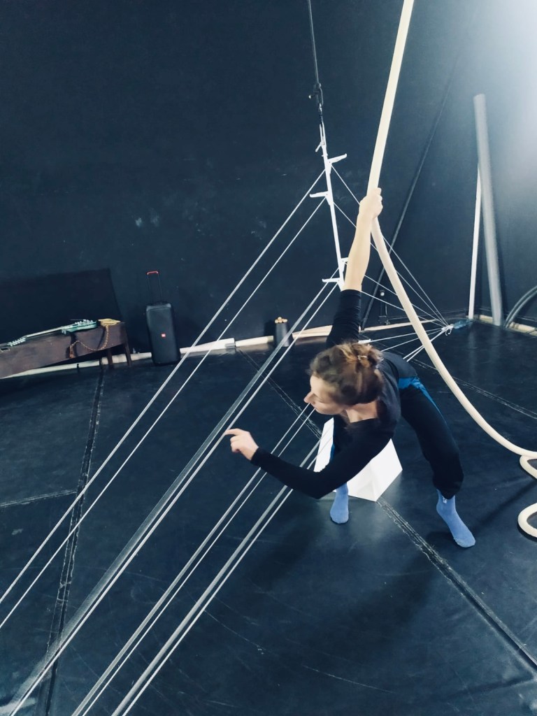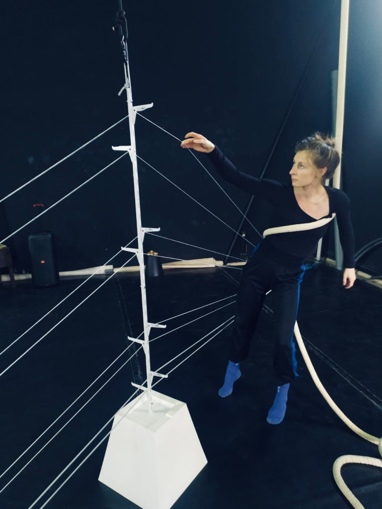“… Im Szenario, das wir am Ende umsetzten, ist der Mittelmast über einen Flaschenzug mit dem Zirkusapparat Vertikalseil verbunden, was mir die Möglichkeit gibt, über das Gewicht, was ich ins Seil gebe, die Spannung der Saiten zu kontrollieren. Es ergibt sich allein in der Mechanik eine Synergie durch die Spannung des ‘zum Leben erwachenden‘ Instrumentes und meiner Bewegung am Seil.“